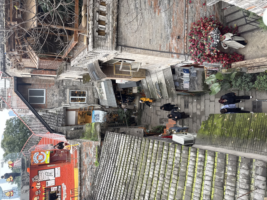 An overhead shot reveals a narrow alleyway enclosed by aged buildings, showcasing a blend of red brick, concrete, and weathered roofs. Pedestrians navigate the stone-paved path, passing by laundry lines and a collection of potted plants. An eye-catching display of red roses adorns a corner, framing figures in white coats and light pants. Architectural details include an old wooden structure, windows, and moss-covered rooftops. The scene has an eclectic, lived-in character.