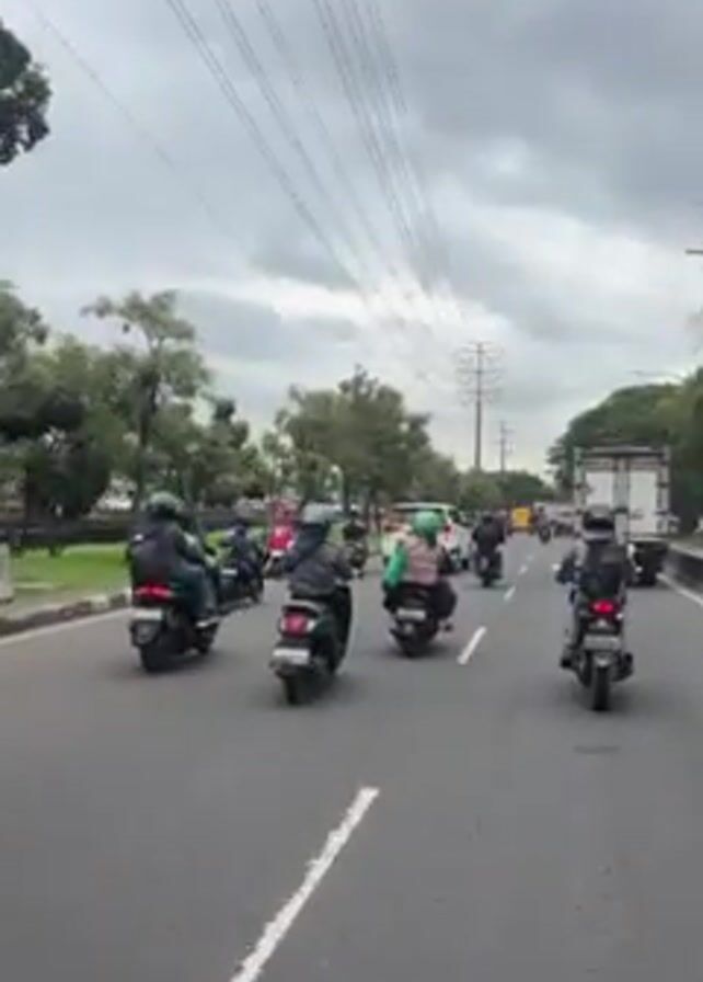 The video captures a bustling road scene on an overcast day. The camera is positioned from the perspective of a motorcycle rider, presumably moving along the road alongside a stream of other vehicles. Numerous scooters, each carrying one or two individuals, weave through the lanes, a white minivan also joins the flow of traffic in the center lane. A large semi-trailer truck lumbers along the rightmost lane. Lining the sides of the road are trees, and overhead, power lines crisscross the sky. The overall atmosphere suggests an urban or suburban environment during the day, with traffic moving in a steady rhythm.
