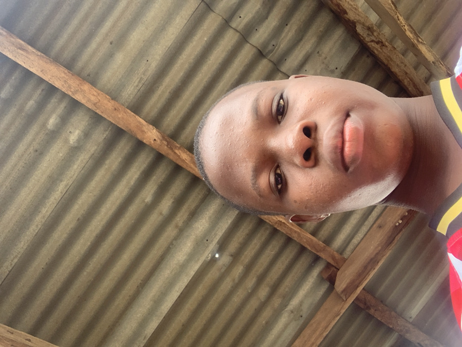 A young individual with dark skin and short hair is depicted in a close-up, head-on portrait, looking directly at the camera with a neutral expression. The subject's upper chest shows a garment with red, white, yellow, and black stripes. The background features a corrugated metal roof, supported by several visible wooden beams or rafters running diagonally across the upper portion of the frame. The scene is located in Adankolo, Nigeria.