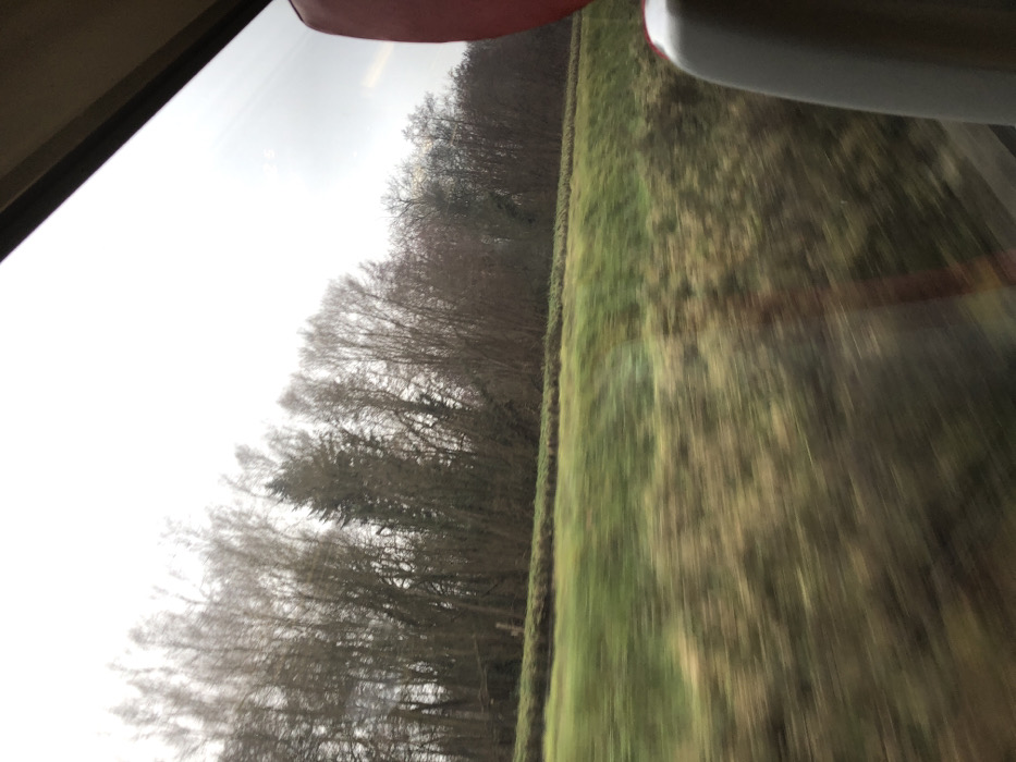 The image depicts a landscape observed from a moving vehicle in the city of Steinbourg, France. The view is framed by the interior of the vehicle, featuring a dark window frame visible along the top and right edges, with a portion of a red seat back and a light-colored, possibly beige or grey, seat component visible in the far right foreground. Outside the window, the immediate terrain consists of a green and brown grassy field, displaying significant horizontal motion blur indicative of high speed. Beyond the field, a dense line of trees, primarily bare deciduous trees interspersed with several evergreen conifers, forms a dark, horizontally blurred barrier. The sky above is overcast, appearing bright white to light grey, with minor motion blur. No individuals or specific interactions are discernible.