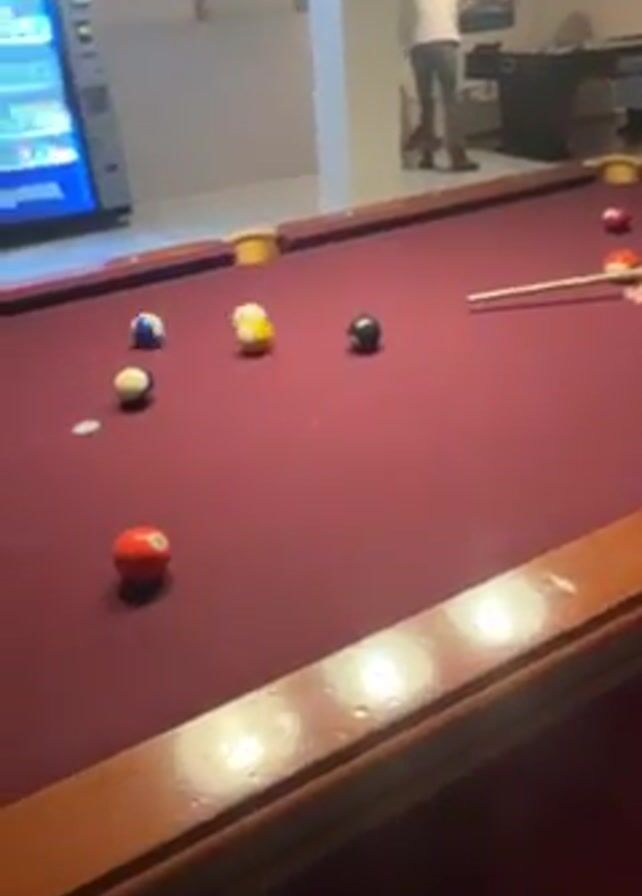 person playing pool. The pool table is red and there are several balls on the table, including the eight ball. A person wearing a white sweater and jeans is standing in the background near a vending machine. The camera pans around the table as the player lines up a shot. The player strikes the cue ball.