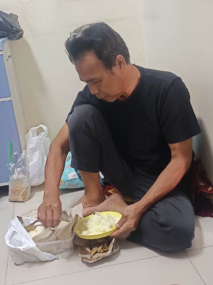 An Asian man in a black t-shirt and gray pants is squatting on a tiled floor, looking down at a collection of food items. He's holding a yellow plate of white food, seemingly transferring it from a white plastic bag containing a brown container. Other food items, wrapped in brown paper, are visible near his feet. A white cabinet with blue drawers stands to his left, and additional bags are scattered around the scene.