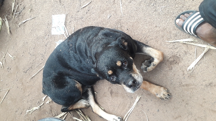 The scene is set outdoors on reddish-brown sandy earth in Awada, Nigeria. A black and tan dog, consistent with a Rottweiler or Rottweiler mix, is lying curled on its left side, facing towards the viewer. The dog exhibits tan markings above its eyes, on its muzzle, and on its legs. Its fur has scattered light-colored debris. The ground around the dog is sparsely covered with dried, light-colored plant matter, resembling straw, and a crumpled piece of white paper or plastic is visible. In the lower right quadrant, a human right foot, wearing a black and white striped slide sandal, is present next to the dog. The dog appears alert, looking directly at the camera.