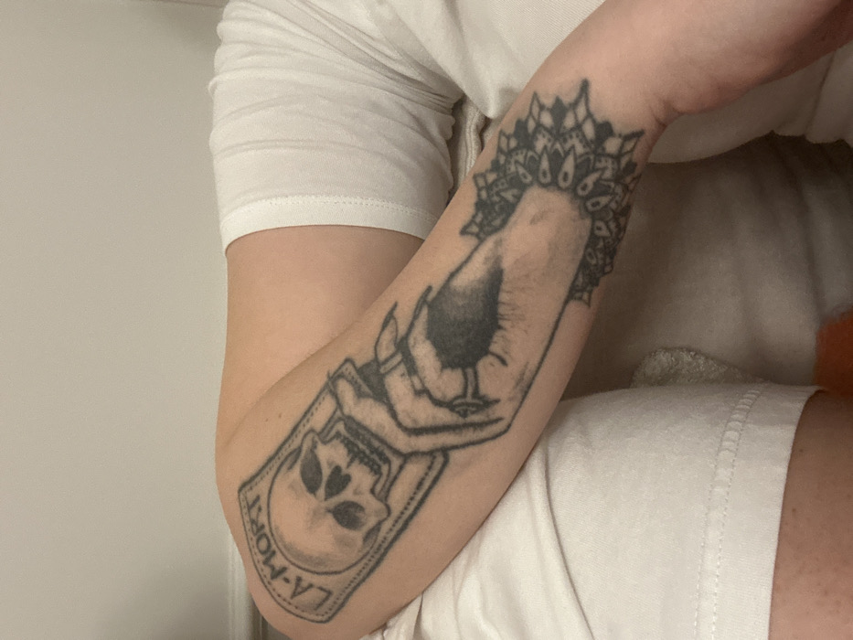 The image displays a close-up, downward-angled view of a person's upper limb, likely a forearm or calf, positioned indoors against a plain, light-colored wall background. The specific location in Sofia, Bulgaria, cannot be determined from the provided visual information. The central subject is a person's light-toned skin, bearing multiple black-ink tattoos. The primary tattoo is a rectangular design resembling a playing card or tarot card. At the top of this design, an arched banner contains the text "LA-MORT." Below this, a human skull is depicted. Beneath the skull, a stylized human hand with long fingers and rings is shown, appearing to grasp or frame a large, dark eye design. This eye features a prominent, dark pupil/iris. Below this main tattoo, a secondary, partial mandala-style tattoo with intricate, symmetrical patterns extends further down the limb towards the unseen wrist or ankle. The limb is partially obscured by white or light-colored fabric, consistent with casual clothing such as sweatpants or pajama bottoms, visible on the right side and lower left portion of the image. Another light-colored, soft fabric, possibly bedding or a cushion, is visible beneath the limb on the lower left. The background consists of an unadorned, light-toned wall, with a faint horizontal line suggestive of a baseboard at its bottom edge. The scene is evenly lit. No other individuals or actions are discernible.