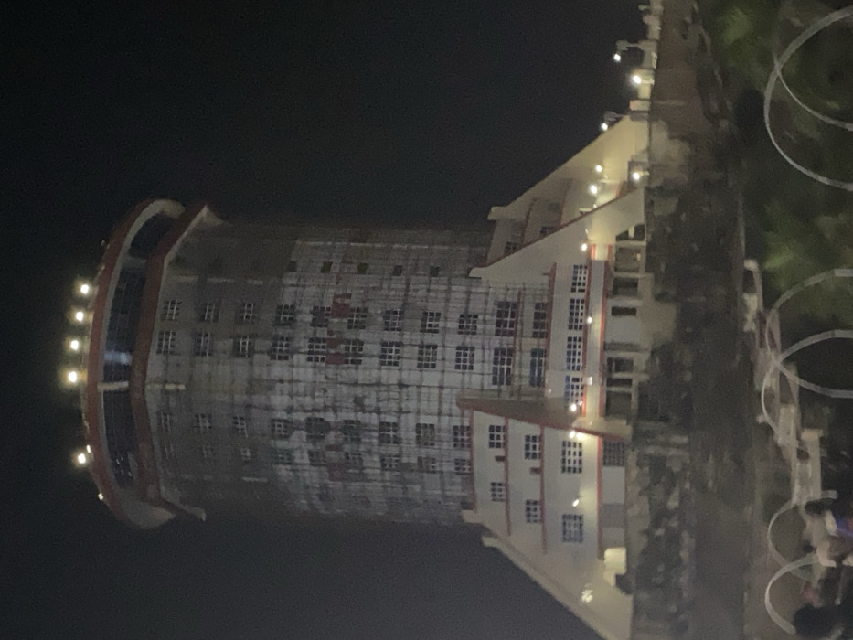 A night shot shows a tall, cylindrical building under construction. It has a rounded top with lights. Scaffolding covers the exterior. Adjacent is a lower, angular building with multiple floors and white trim. The scene is dark with some visible trees and fencing in the foreground.