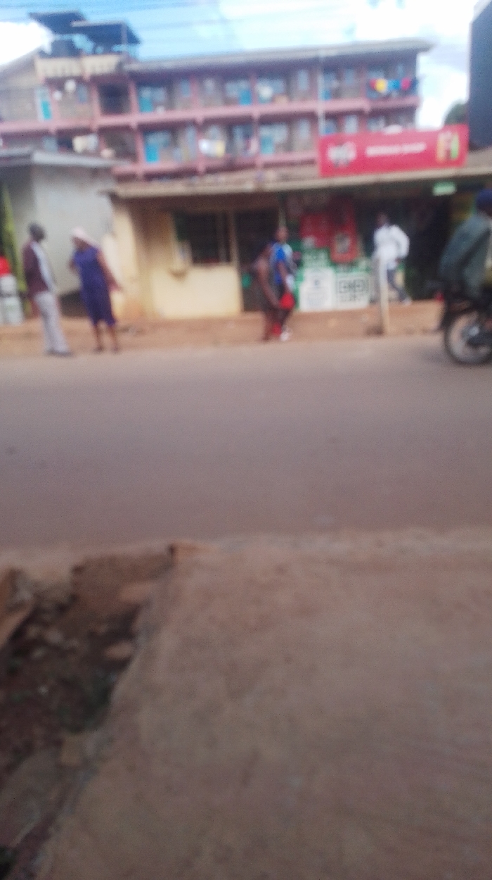 A blurry street scene shows several people standing and walking near a storefront with a red sign. A multi-story building with pink paint is visible in the background, possibly apartments or businesses. A motorcycle is parked or moving to the right. The foreground is blurry, displaying a sidewalk or paved area. Overall, the scene seems to depict everyday life in an urban or semi-urban setting, though the image quality limits detailed observations.