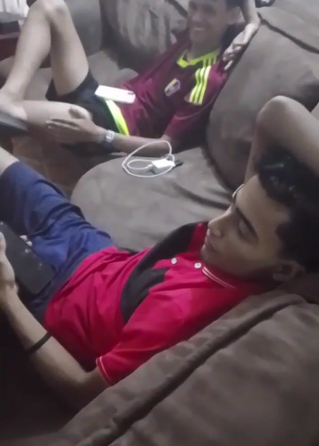 Two young men are relaxing on a brown sofa in what appears to be a home setting. The man in the foreground is lying down, dressed in a red polo shirt and blue shorts, looking down at a phone he holds in his hands. Behind him, another man is reclining with his head resting on his hand, wearing a maroon and yellow soccer jersey and dark shorts. He's looking towards the first man with a slight smile. A white electronic device with a cable is visible on the sofa between them. The wall behind the couch is painted white.