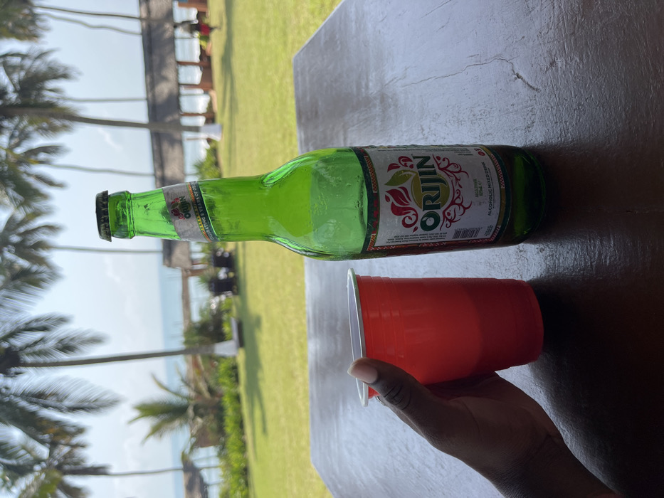 This image depicts a coastal resort scene, identified as being in the Kasoa area of Ghana. In the foreground, a dark-brown wooden surface, likely a table, occupies the bottom half of the frame. On this surface, a dark-skinned hand is observed gripping a red disposable plastic cup containing a reddish-brown liquid. Adjacent to the cup, a 500ml green glass bottle of "ORIJIN" alcoholic mixed drink stands upright. The bottle is open, with its metal cap resting askew on the lip, and condensation is visible on its exterior. The midground features a well-maintained green lawn extending towards the background. Numerous palm trees are interspersed across the lawn. Several dark lounge chairs or sunbeds are visible beneath multiple thatched-roof shelters positioned on the lawn. A single, indistinctly clothed individual is observed walking on the far right portion of the lawn, near one of these shelters. The background reveals the blue ocean under a clear, light blue sky, with additional palm trees and thatched structures lining the distant shoreline.