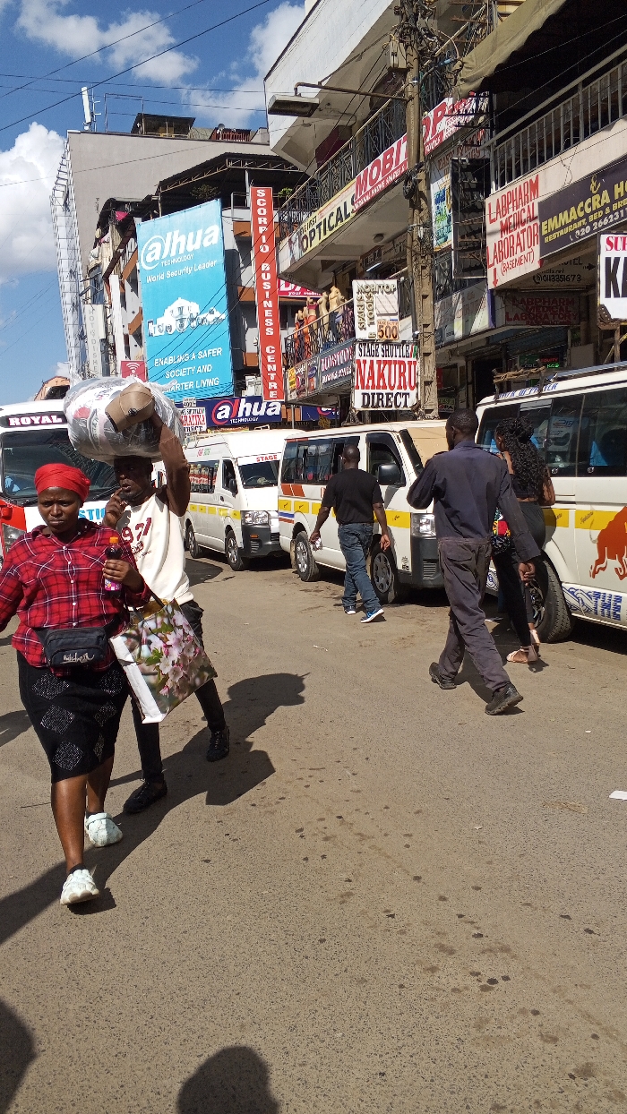 The image depicts a bustling street scene in Nairobi, Kenya, likely within the Central Business District or a major transport hub, characterized by numerous commercial buildings and public transport vehicles. The sky is partly cloudy. **Environment:** The street is paved with a light gray-tan surface, marked by scattered dark stains. Multi-story commercial buildings line the street, their facades heavily covered with various brightly colored signs, indicating businesses such as "Dahua Technology World Security Leader" (a large blue banner), "SCORPIO BUSINESS CENTRE" (a vertical red sign), "OPTICAL," "LABPHARM MEDICAL LABORATORY," "EMMACRA HOTEL," and "NAKURU DIRECT STAGE SHUTTLE." Overhead, a dense network of black electrical and communication cables is visible, strung between utility poles and buildings. A white antenna structure is present on the roof of a building on the far left. **Vehicles:** Three white minibuses (matatus), typical Kenyan public transport vehicles, are visible. One is partially seen on the far left, displaying "ROYAL." Another is in the midground center, while a third is on the midground right, partially obscured, with a red bull logo on its side. **Individuals:** Five individuals are present, all appearing to be walking. 1. **Foreground Left:** A woman, dark-skinned, wears a red headwrap, a red and white plaid long-sleeved shirt, a dark patterned skirt, and white sneakers. She carries a black fanny pack across her chest and holds a small clear bottle containing a red liquid in her left hand, and a white shopping bag with a floral pattern in her right hand. 2. **Foreground Center:** A man, dark-skinned, walks to the right of the woman. He wears a light-colored t-shirt, dark trousers, and dark shoes. He carries a large, light-colored bundle on his head, topped by a light brown baseball cap. He holds a white-patterned bag in his left hand. 3. **Midground Right (Walking Away):** Two individuals are walking away from the viewer. One is a man in a dark shirt and dark trousers. The other is a woman with long, dark, curly hair, wearing dark clothing. 4. **Midground Center-Left (Walking Away):** A man in a dark t-shirt and blue jeans walks away from the viewer, between two minibuses. He holds a white object in his right hand. **Actions:** The individuals are engaged in walking along the street, suggesting pedestrian movement through a busy urban area. The presence of matatus and the "NAKURU DIRECT STAGE SHUTTLE" sign indicate a public transport nexus where passengers are likely embarking or disembarking.