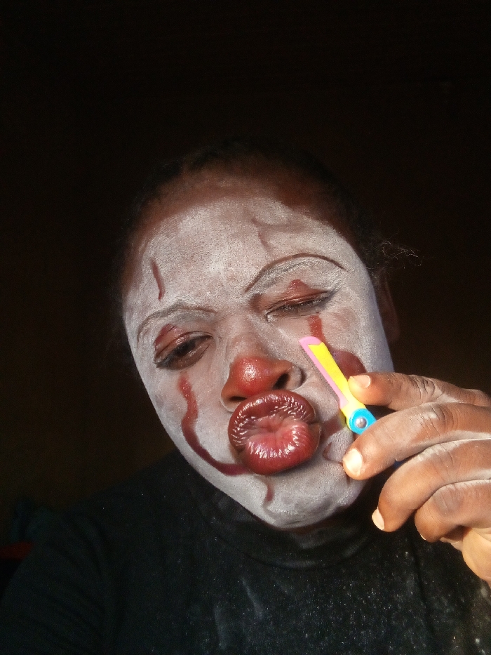 A person in clown makeup holds a small colorful razor near their puckered, glossy, dark red lips. The face is covered in white paint with dark red streaks mimicking tears from the eyes. Sharp, arched eyebrows and a winking left eye add to the unsettling look. Dark skin is visible under the makeup on the hand holding the razor. A dark turtleneck sweater is worn against a dark background.