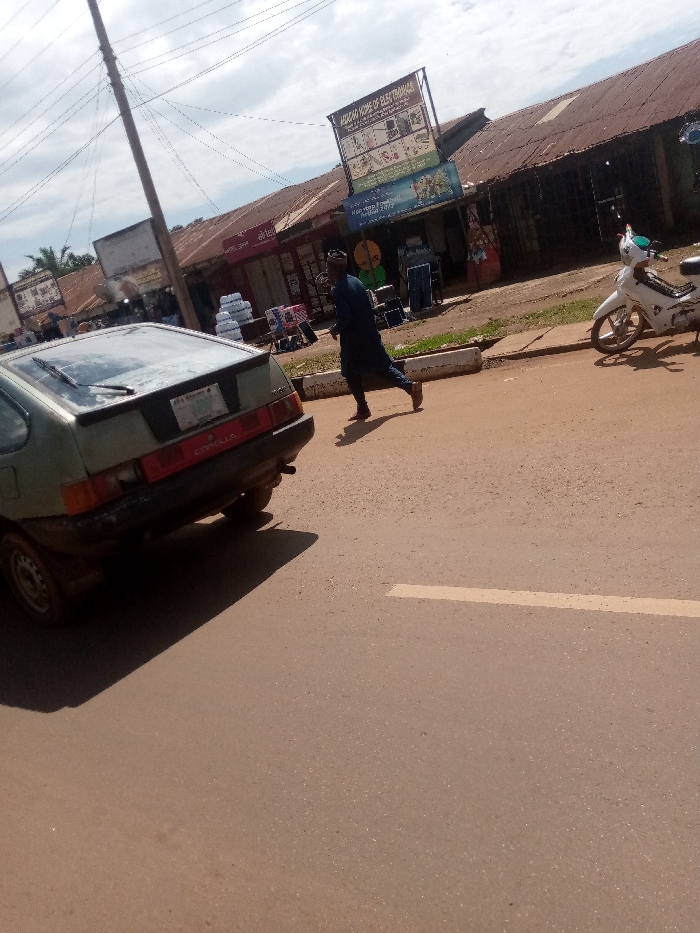 The scene depicts a commercial street in Maigizo, Nigeria, under a bright, partly cloudy sky. A light green/grey hatchback car, identified by "Corolla" on its rear, is positioned in the lower-left foreground, partially obscuring its license plate. It faces away from the viewer, parked on a paved road that extends towards the right. A dark-clad male figure, likely an adult, is visible in the midground, walking right-to-left across the paved road, away from the car. He wears a dark blue long garment and a head covering. A white scooter or motorcycle is parked on a dirt shoulder to the right of the paved road. The background features a row of single-story commercial buildings with weathered corrugated metal roofs. A prominent sign above the buildings reads "AFRICAN HOME OF ELECTRONICS" and a blue sign below mentions "Hertop Football" and "2012". Another visible sign reads "Airtel 5G". Goods, including stacked plastic containers and what appear to be solar panels, are displayed outside some storefronts. An electricity pole with multiple overhead wires stands in the upper-left, extending diagonally across the frame.