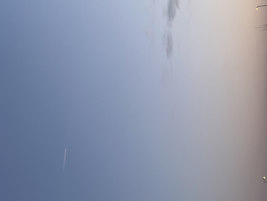 An outdoor image captures a broad expanse of sky over Roodt-sur-Syre, Luxembourg, during what appears to be twilight. The sky exhibits a gradient, transitioning from light blue at the top to a pale pinkish-orange towards the horizon. A single, thin, white linear contrail is visible in the upper left quadrant of the frame, indicative of an aircraft's passage. In the lower right quadrant, a small cluster of diffuse, light grey clouds is present. The extreme bottom edge of the image reveals a dark, indistinct silhouette of the horizon, potentially showing parts of the landscape or distant structures, including a partial view of a lit street lamp on the far left. No individuals, explicit actions, or direct interactions are discernible within the frame.