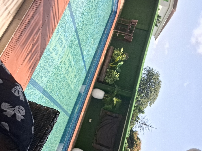 The image captures an outdoor swimming pool environment in Itirin, Nigeria, under clear daylight conditions