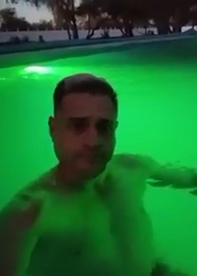 A man with short brown hair and a light complexion is shown from the chest up, swimming in a pool. He faces forward, looking directly at the camera, and moves slightly in the water. The pool is illuminated with green, then blue, lights, and the background reveals what appears to be an outdoor area at dusk, with trees and a fence visible.