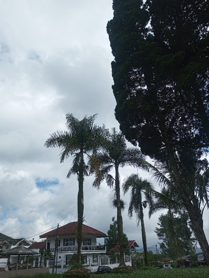 The image displays an outdoor scene in Nuwara Eliya, Sri Lanka, under a sky largely covered by grey clouds, with segments of lighter blue sky visible towards the left. The right side of the frame is dominated by a very tall, dense, dark green conifer tree, extending vertically beyond the top edge. To its left, a grouping of at least four tall palm trees with green fronds and slender, sometimes mossy, trunks stands in the midground. In the central-left midground, a two-story house with white walls, dark-framed windows, and a reddish-brown tiled roof is prominent. This residence features a balcony on the second floor with white railings. A dark sedan is parked in front of the house, partially obscured by low-lying reddish-pink flowering plants, possibly part of a garden. To the immediate left of this main house, a light-colored gazebo-like structure with a conical roof is visible behind a fence or wall. Further back and to the right of the main house, another smaller structure with a brown roof is discernible amidst additional background trees. The foreground consists of cultivated green vegetation, suggesting a garden or agricultural plot. No individuals are present in the scene, and no specific actions or interactions are depicted.