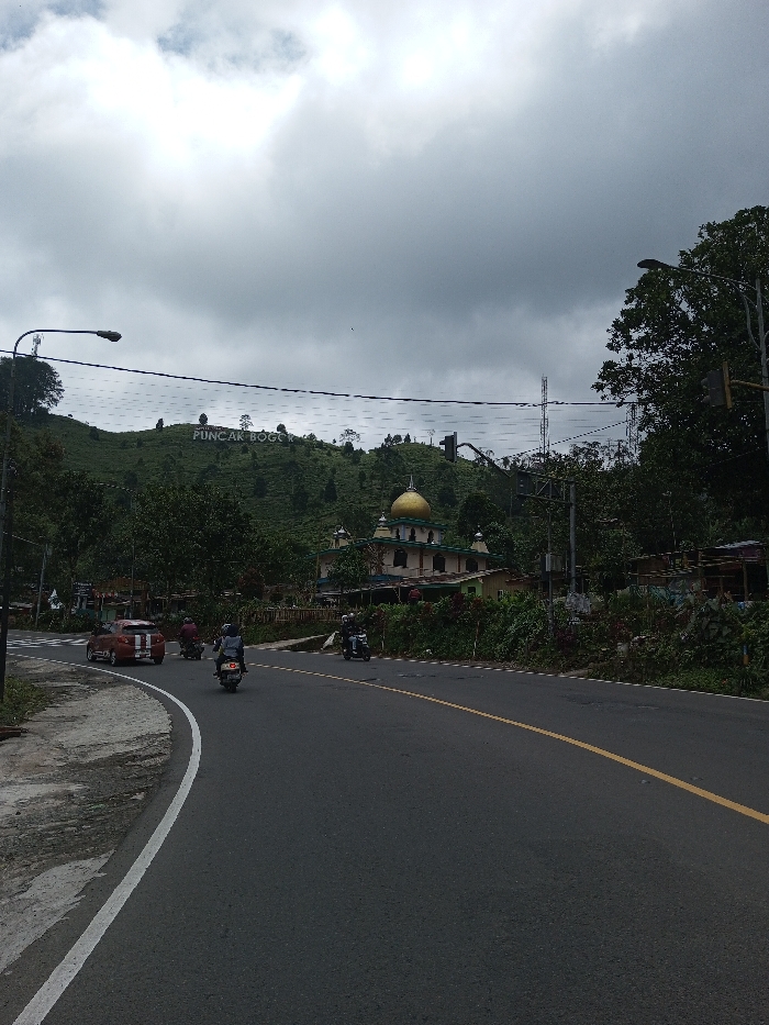 The image depicts an overcast daytime scene on a curving two-lane asphalt road in a hilly, vegetated region. A large sign on a prominent green hillside in the background spells "PUNCAK BOGOR," indicating the location is not Chendenbji, Bhutan. The asphalt road features white edge lines and a solid yellow center line. In the foreground, a red compact car with white racing stripes on its rear is visible, appearing to execute a left turn onto the main road from a side street. Three individuals, each operating a motorcycle or scooter, are positioned on the main road ahead of the car, traveling away from the camera. The closest rider wears a light-colored jacket and helmet. To the left of the road, partially obscured by trees and foliage, stands a structure resembling a mosque, characterized by a prominent golden dome and light-colored walls. The surrounding environment includes dense green trees and shrubs, utility poles carrying overhead wires, and distant hills topped with further vegetation and communication towers. The sky is largely covered by dense, gray clouds.