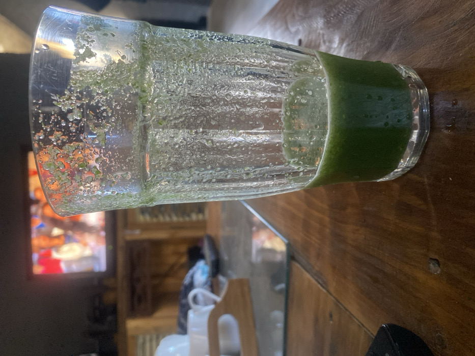 The image depicts an indoor domestic setting, specifically an area within a residence located in Buenos Aires, Uruguay. The primary subject is a clear glass, positioned in the foreground and right of center, containing approximately one-third volume of a dark green, opaque liquid, likely a smoothie or juice. The interior walls of the glass above the liquid level are coated with fine green particulate matter and numerous condensed water droplets, indicating partial consumption or recent vigorous mixing. The glass features vertical fluting on its lower exterior. The glass rests on a dark brown wooden table surface, exhibiting a visible grain pattern. In the lower-left corner of the table, a black electronic remote control is partially visible. Further back on the table, to the left of the glass, a small, clear rectangular glass tray is present. Behind this tray, a white ceramic cup with a handle is visible, positioned on a light-colored wooden or bamboo serving tray. Another white cup or similar item is partially obscured behind the first cup. In the blurred background, a television screen is illuminated, displaying a vibrant, indistinct scene characterized by broad strokes of red, orange, and white, suggesting a televised event. The television is situated on a wooden console or cabinet. The overall lighting is dim, consistent with an indoor environment. No individuals are visible within the frame.
