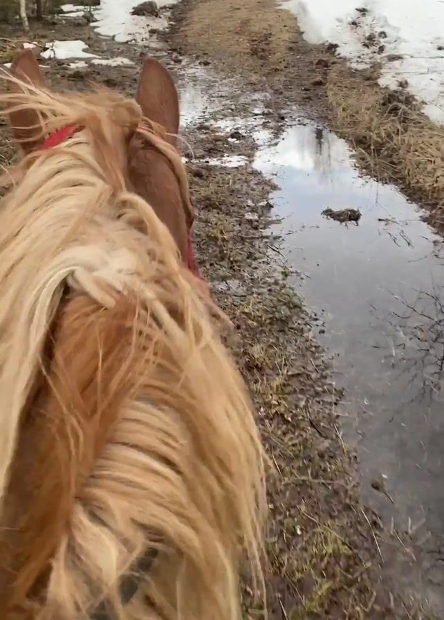The video presents a first-person perspective of a horse riding through a muddy, partially snow-covered landscape. The horse, adorned with a red bridle, trots along a path bordered by puddles and melting snow. The camera is positioned behind the horse's head, showing its blond mane and ears moving with each stride. The surrounding environment includes bare trees, remnants of snow, and patches of brown grass. The overall impression is one of early spring thaw.