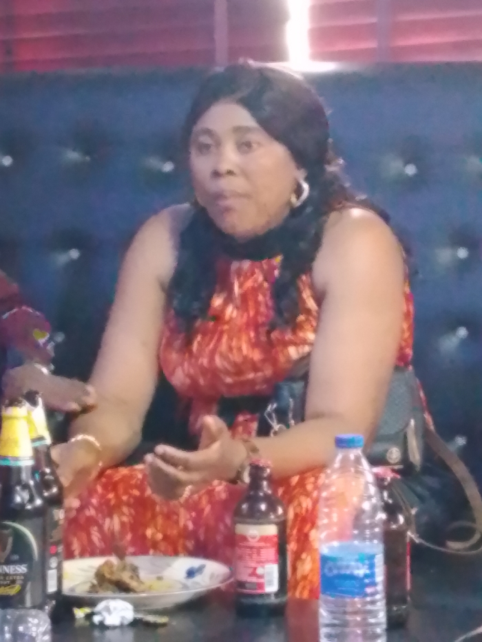 A middle-aged woman with dark hair and large hoop earrings is seated in a dim room. She wears a vibrant red and orange patterned sleeveless dress. A table in front of her holds an assortment of bottles including Guinness, a small brown bottle with a red label, and a clear water bottle. A plate with food scraps rests on the table as well. The woman is gesturing with her hands and appears to be engaged in conversation. A tufted dark blue or black wall serves as a backdrop.