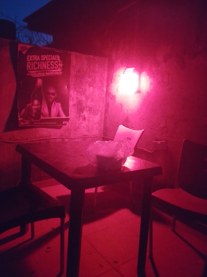 This scene in Narayi, Nigeria, depicts a dimly lit, semi-enclosed space illuminated by a prominent red light from a wall-mounted fixture on the right