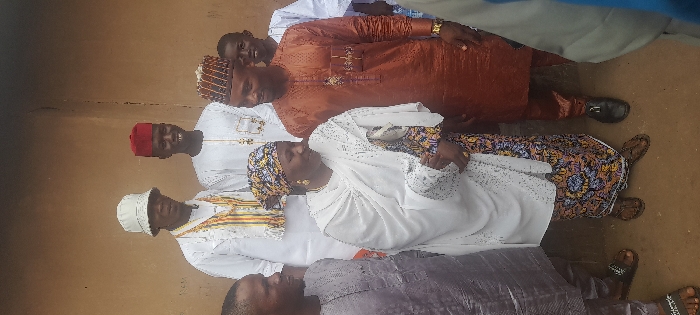 A group of seven individuals is positioned against an earth-toned wall on a dirt ground in Toto, Nigeria