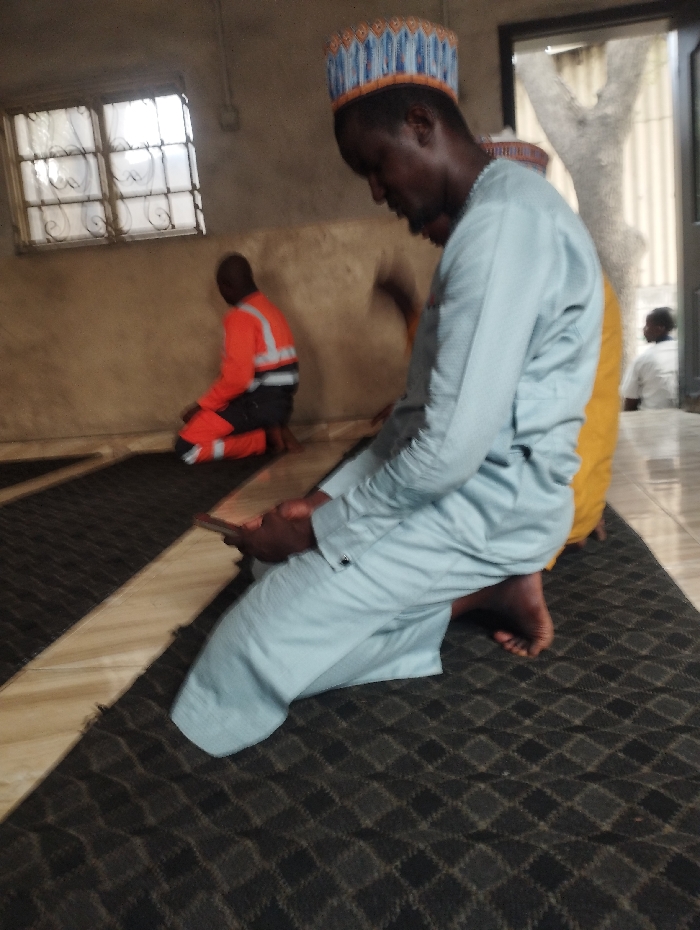 three men in a room with light brown tiled flooring, cream-colored walls, and a black and gray patterned rug. One man is kneeling on the rug, wearing a blue, yellow, and white patterned hat, a light blue robe, and a yellow garment under the robe. He is looking down and holding a black cellular device in his right hand. Another man is kneeling to the left, facing the left of the image. He is wearing an orange long-sleeved shirt and blue jeans, and he is obscured by the man in the foreground. A third man is seated in the background with a blurred image and is wearing a yellow garment. The room has a window with a white frame and a white, decorative, metal grate. The location, based on the coordinates provided, is a residential area in Ashaka, Nigeria.
