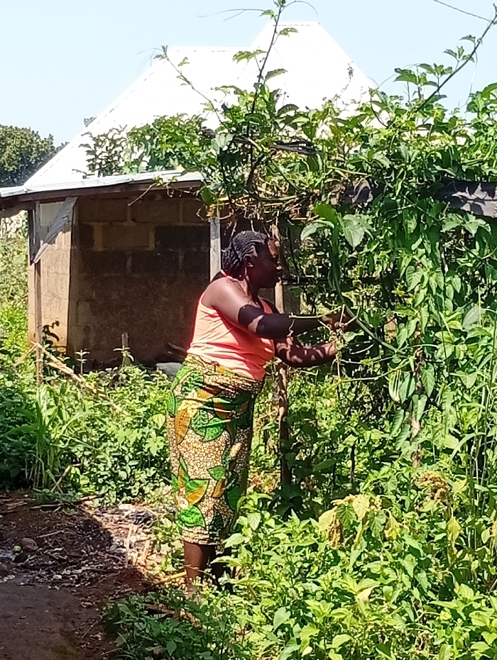 An outdoor scene in Unguwan Rimi, Nigeria, depicts an adult female engaged in a garden