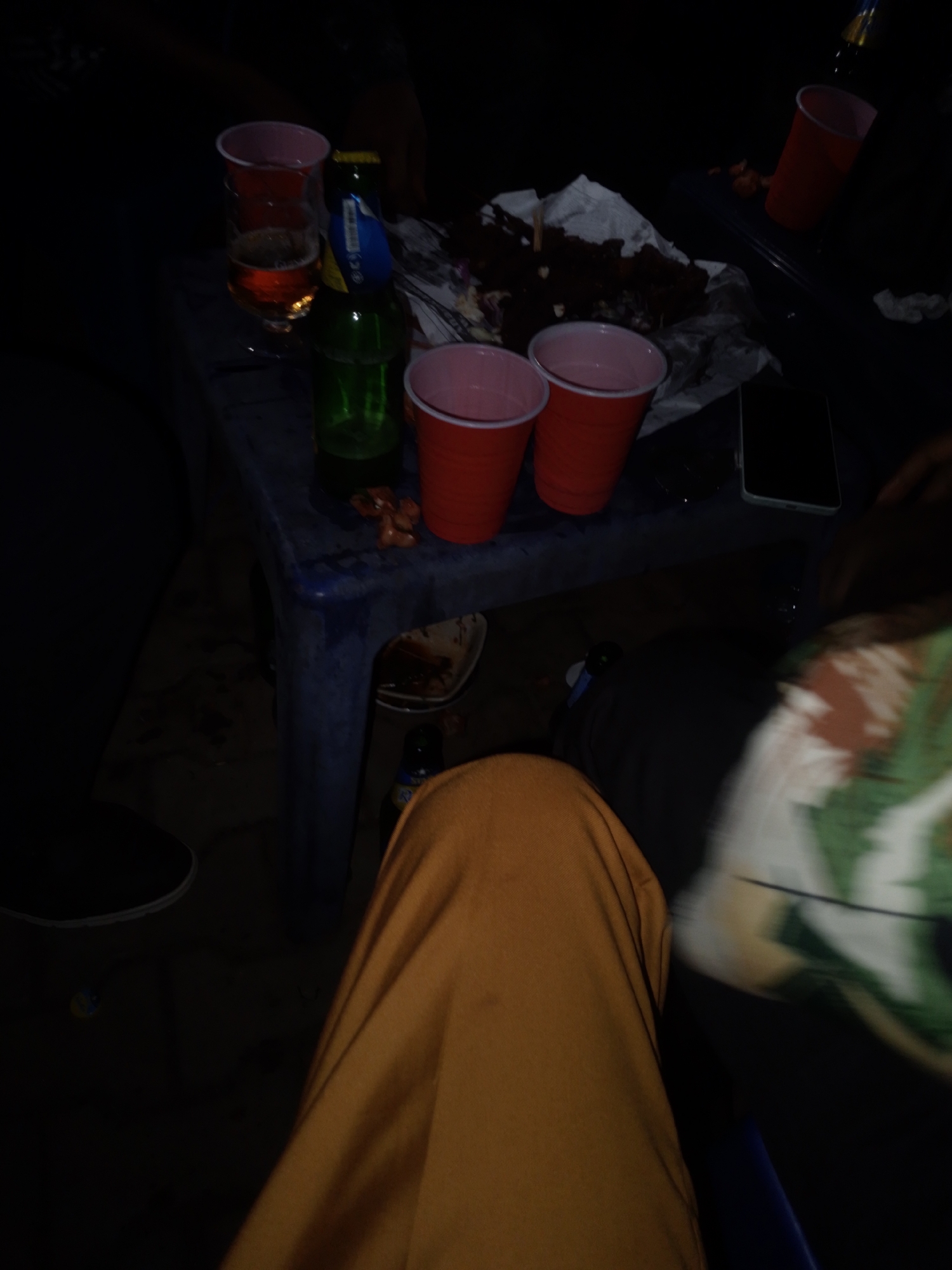 gathering, possibly a party, at night in what appears to be Awka, Nigeria. A low, blue plastic table holds two full red plastic cups, a glass filled with a light brown liquid, and a green beer bottle. A piece of white paper or napkin is stained with a dark substance, potentially food or drink. Scattered pieces of food are also visible on the table. A black smartphone sits next to the table. The scene is dimly lit. An individual wearing mustard-colored pants and a white and green patterned shirt is seated nearby. Part of a black shoe is visible in the dark background.