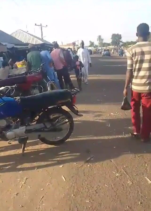 street scene with a group of people and several motorcycles. Many people appear to be standing or walking around, some wearing traditional clothing. A man in a white robe walks toward the camera. A man in a striped shirt and red pants walks away from the camera carrying a shoe in his hand. Parked motorcycles are visible on the side of the road. The ground appears to be dusty or sandy. There are buildings and market stalls in the background. The sky is clear and bright.