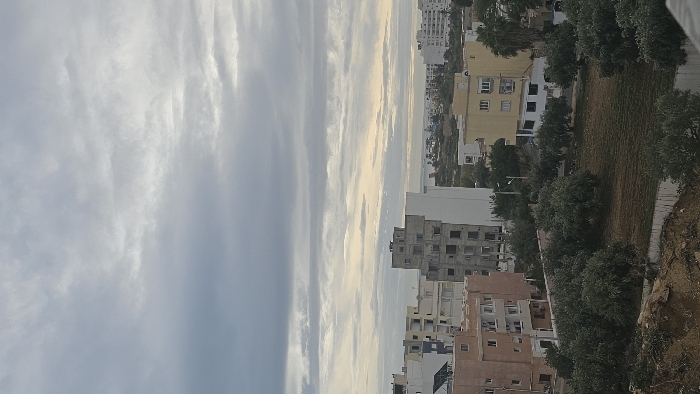 This image depicts an elevated view of an urban landscape in Sousse, Tunisia, under an overcast sky. The foreground consists of an earthen embankment on the left, transitioning to a plot of land dominated by numerous dense, dark green trees and a central patch of brown and green ground cover, bordered by a concrete retaining wall. In the midground, a collection of multi-story buildings is visible. A prominent pinkish-brown residential structure with multiple windows and balconies is situated on the left. To its right and slightly behind, a tall, unfinished grey concrete building with exposed structural elements and numerous open window frames stands next to a tall, unadorned white building section. Further to the right, a yellow multi-story building with balconies is present, with a palm tree adjacent to it. Various other white and light-colored buildings are scattered throughout the midground, along with a street light. The background reveals the Mediterranean Sea extending to the horizon, with a strip of urban development comprising white buildings lining the coastline. The sky is predominantly grey and white, covered by multiple layers of clouds, with a subtle yellowish luminosity along the horizon above the sea, indicative of low sun conditions. No people are discernible within the frame.
