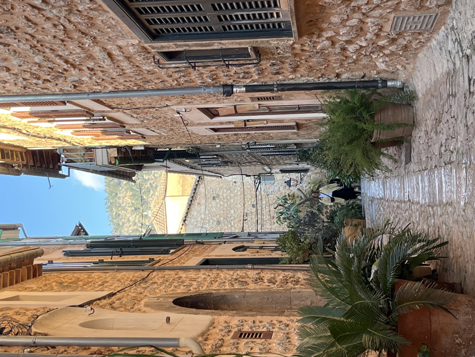- "The image displays a narrow, ascending cobblestone street in Fornalutx, Spain, flanked by two multi-story buildings constructed from reddish-brown rough-hewn stone" by FM-Gp7zE3, licensed under CC BY 4.0