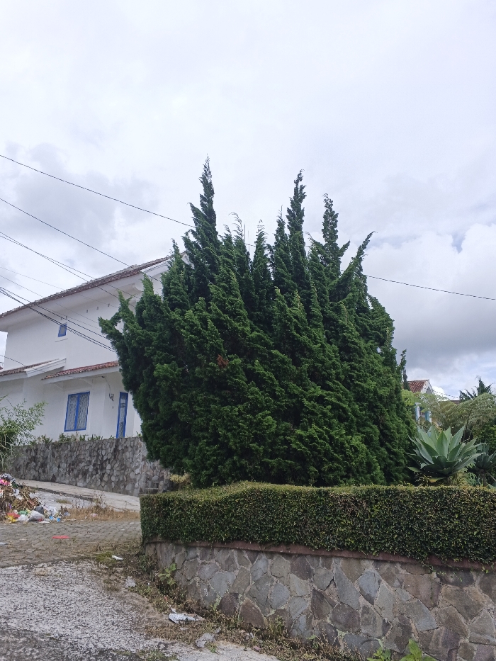 A tall, verdant cypress tree dominates the frame, positioned in front of a stone wall topped with a trimmed hedge. To the left, a white house with blue-framed windows stands adjacent to a sloping stone wall. A pile of litter is visible nearby. An agave plant is visible right of the cypress. Overhead, gray, cloudy skies and power lines add to the scene. The ground is paved, and the photograph is taken from a ground-level perspective.