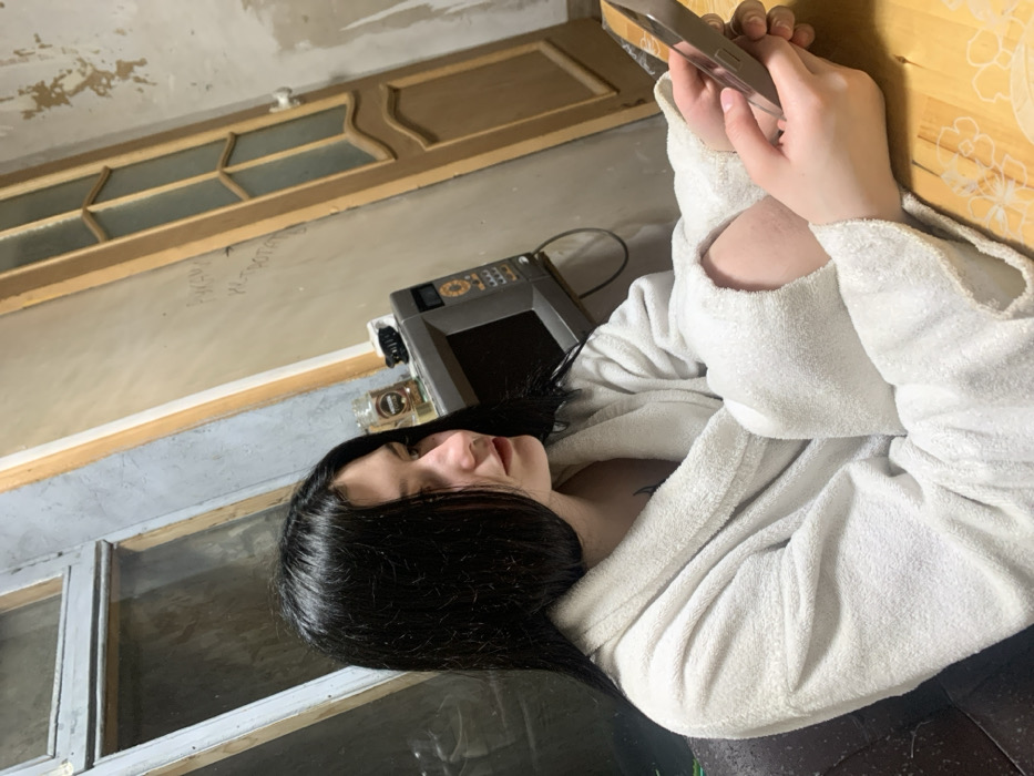 A woman in a white bathrobe reclines, looking at a smartphone. She has long, dark hair that partially covers her face. Next to her is a gray device with a digital display and buttons, and a small bottle. The background features a window and a patterned wooden door or wall. The lighting is dim, casting shadows on the scene.