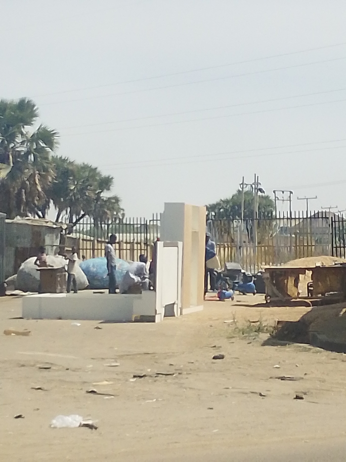 An outdoor scene in Darmanawa, Nigeria, depicts a dusty, unpaved open area under a clear sky. In the mid-ground, a metal fence separates the foreground activity from a line of palm trees and utility poles with power lines in the background. In the left mid-ground, a corrugated metal structure is partially visible behind several large, irregularly shaped bundles covered in light blue and grey material. Adjacent to these bundles, a wooden table is present. Two individuals, appearing to be young males, are near this table; one stands beside it, while another stands further left near the bundles. Centrally, a partially assembled or dismantled light-colored modular structure, consisting of white and beige panels, stands on a raised platform. To the right of this structure, several more individuals are present; one male in a light shirt and dark trousers stands near the structure, and others are partially obscured behind it, with one appearing to be squatting. On the right side of the mid-ground, a large, rusty, open-topped industrial container is visible. A person in a blue top and light-colored trousers stands near this container. Two blue, wheeled air compressors or similar machinery are positioned on the ground in front of the container. The foreground consists of barren, light brown earth with scattered debris, including a white plastic bag. The overall impression is that of an informal outdoor workspace or gathering area.