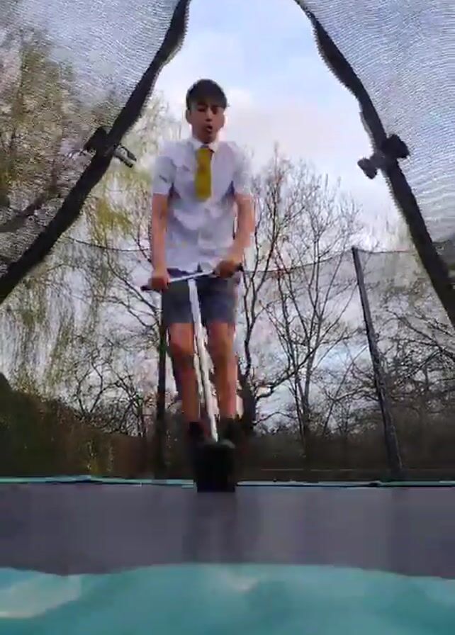 A person wearing a white shirt, shorts, black socks, and a yellow tie is seen indoors on a trampoline, from a low-angle view. The person is riding a pogo stick. The trampoline is enclosed by a net. Beyond the net are trees. The person jumps in the air on the pogo stick. The sky is visible above the trampoline.