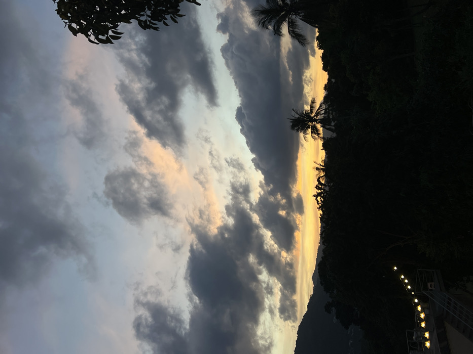 The image displays a tropical landscape scene at twilight in บ้านบางรักษ์, Thailand. The sky exhibits a gradient of colors, with an intense orange and yellow band along the lower horizon, fading into lighter pale blues and hints of pink higher up. Numerous dark grey, fragmented clouds are distributed across the sky, particularly dense in the mid and upper portions. A silhouette of undulating hills or mountains is visible on the far-left horizon. The midground and foreground are dominated by a dense, dark canopy of tropical vegetation, including several identifiable palm trees silhouetted against the sky on the right. In the lower-left corner, a partial view of an architectural structure, possibly an outdoor patio or balcony, is present, featuring a railing and a string of illuminated warm-toned incandescent lights. No individuals or specific actions are discernible.