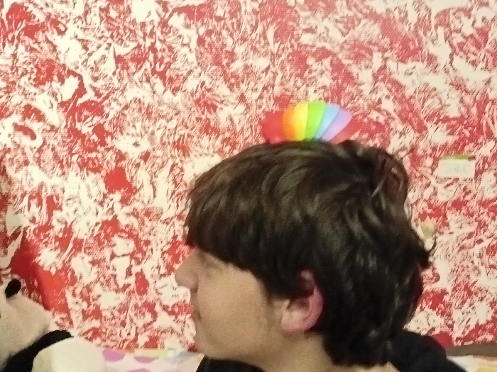 A child is seen in profile with a toy rainbow balanced on their head. They have short, dark brown hair. Their face is visible from the side, showing their nose, mouth, and ear. The background is a busy pattern of red and white. Part of a plush panda toy is visible in the lower left corner. The child is wearing a dark-colored shirt. A small, light-colored object, possibly a note, is affixed to the wall behind the child's head.