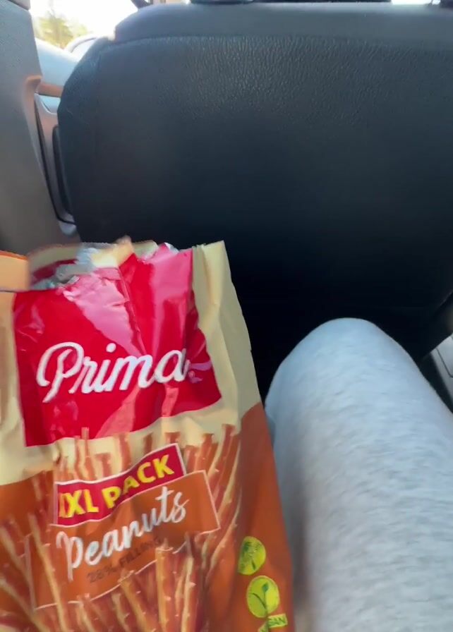 interior of a car. A hand holds a bag of "Prima XXL Pack Peanuts" in the back seat. The camera pans to show the driver, a man wearing a white shirt and baseball cap, and then shows the view out the window, revealing a building with "KRALJI" on the front. The car is moving. The interior is mostly black and grey.