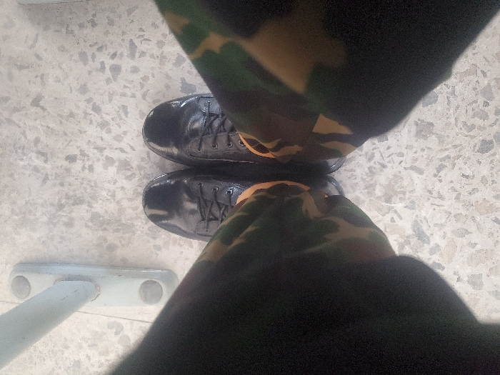The image, taken from a high-angle perspective, shows the feet and lower legs of an individual standing on a light grey terrazzo or polished concrete floor. The person is wearing dark camouflage trousers with green, brown, and black patterns. Their feet are clad in polished black lace-up boots, with an orange lining or sock visible at the boot collar. To the upper left of the frame, a light grey metal pole with a rectangular base plate and two circular caps is visible, secured to the floor. The scene depicts an indoor environment; the exact location in the city of Unknown, Unknown, is not identifiable from the visual evidence.