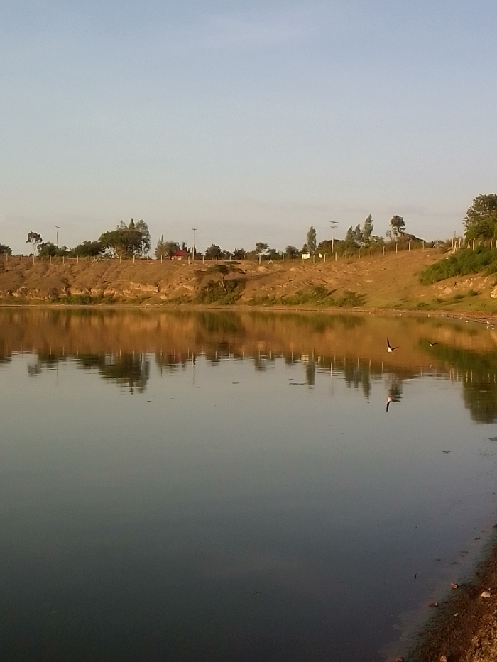 The image depicts a tranquil outdoor scene in the city of Central Kasipul ward, Kenya, dominated by a calm body of water under a clear, pale blue sky. In the foreground, the water's surface, reflecting the distant landscape, covers the lower two-thirds of the frame. A single bird, appearing black and white, is captured in mid-flight directly over the water, its clear reflection visible beneath it. The far bank across the water consists of a gently sloping, reddish-brown earthen hill, sparsely covered with green and brown vegetation and rocks. Along the crest of this hill, a fence line with vertical posts stretches horizontally. Beyond the fence, several trees and utility poles are visible. A small structure with a reddish roof is discernible on the left side of the distant bank, while other minor structures or signs appear along the fence line to the right. The overall lighting suggests either early morning or late afternoon, creating a warm glow on the landscape and its reflection in the water. No human figures are present.