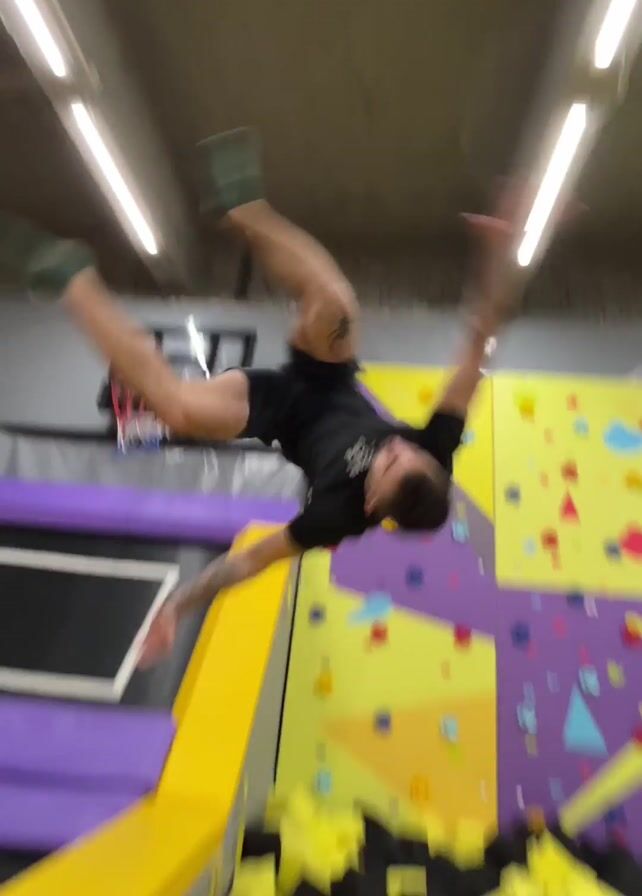 Here is a brief description of the video: A man performs a flip off a trampoline and lands in a pit of foam blocks. He is wearing a black t-shirt. The walls of the room are decorated with colorful climbing holds. A basketball hoop is visible in the background. The trampoline is surrounded by purple and yellow padding.