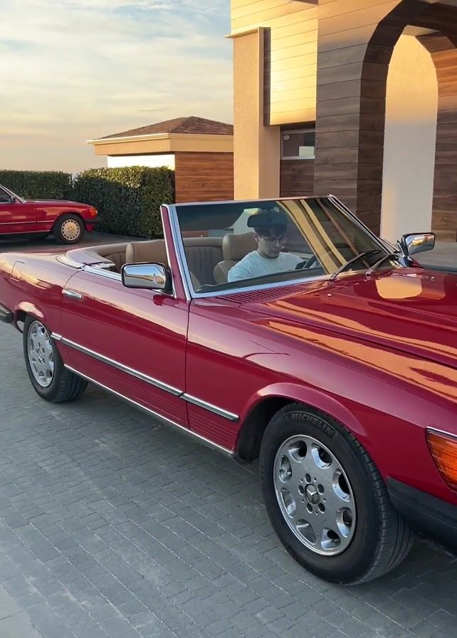 two red Mercedes SL convertibles parked on a paved driveway. A young man is sitting in the driver's seat of the car closest to the camera. The car in the background has a hardtop. The camera pans towards the end of the driveway to a paved road. The scene is set in the countryside during what appears to be late afternoon or early evening.