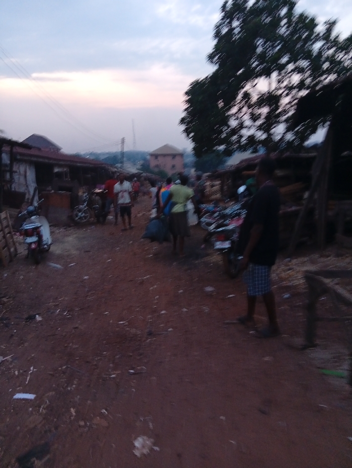 A dirt road scene with buildings on either side and people milling about. Several motorcycles are parked near the buildings. A tall tree looms on the right. The sky is overcast with a hint of twilight. Debris litters the ground. The scene appears to be a bustling but somewhat chaotic village street.