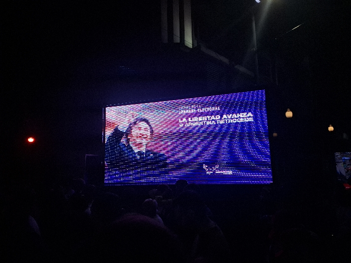 The image displays a nighttime scene at a political event venue in Buenos Aires, Argentina