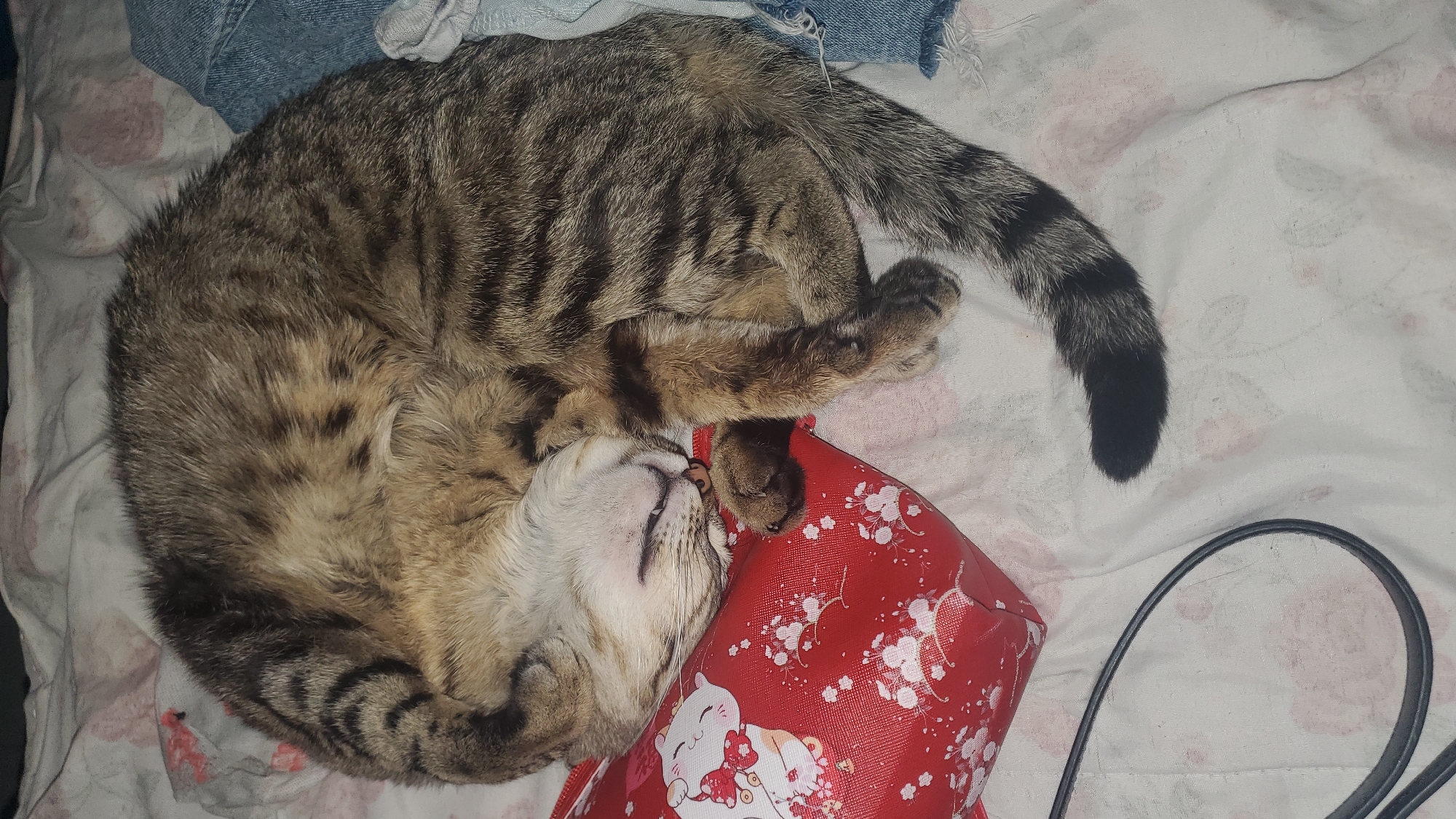 The image displays an indoor scene in Curitiba, Brazil, featuring a domestic short-haired tabby cat. The cat, exhibiting brown, black, and tan striped fur, is observed sleeping in a curled position, with its head resting on a small, red rectangular bag. The bag is patterned with white cherry blossoms and a white cartoon Maneki-neko figure. The cat's eyes are closed, and its light-colored muzzle is visible. Its front paws are tucked near its head, and its tail, with distinct black rings, extends towards the lower right. The cat and the bag rest on a white fabric surface with faint pink floral patterns, indicative of a bed sheet or blanket. To the immediate right of the cat, a crumpled piece of blue denim fabric is visible. A thin black strap is present in the lower-left corner of the frame.