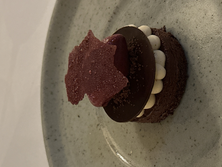 - "A sophisticated dessert presented on a gray plate features a circular chocolate base with white dollops" by FM-o3SHn1, licensed under CC BY 4.0