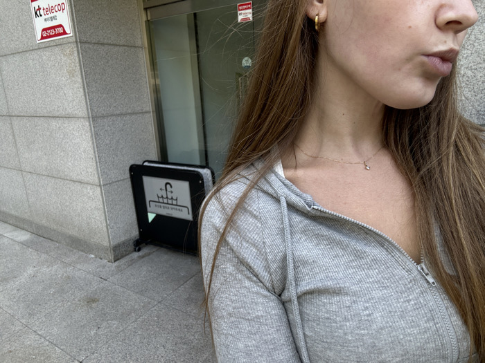 An outdoor scene in 서대문구, South Korea, depicts a female subject positioned on the right, partially obscuring the background. The subject is a woman with fair skin and long, light brown hair, visible from the mid-torso upwards, facing left with her lips slightly pursed. She wears a light gray, ribbed, zippered hooded top, partially unzipped. A delicate gold chain necklace with a small pendant adorns her neck, and a small gold hoop earring is visible in her left ear. The background consists of a building facade constructed from light gray, rectangular stone or tile panels. Affixed to the building wall on the upper left is a white rectangular sign with red lettering "kt telecop," "무인관제 CCTV," and a phone number "02-2129-3700." Below this, a glass door reflects ambient light. On the paved sidewalk in front of the building, a black A-frame sign is present, featuring a white graphic resembling a hanger or hook, with Korean text below it. The ground is paved with light gray rectangular tiles. No active interactions are depicted; the subject appears to be posing for the camera.