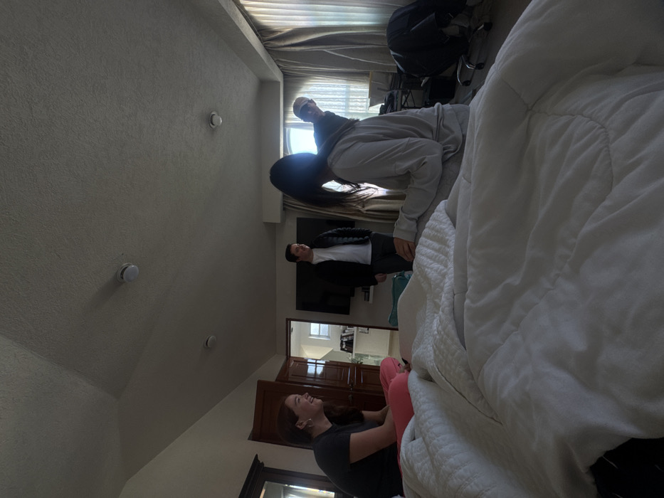 The image depicts an interior scene, identified as a bedroom in Cacalomacan, Mexico. Four individuals are present under daylight conditions, with natural light entering from a window on the right. In the foreground, a bed with white, rumpled bedding is visible. From left to right: A female, with brown hair, wears a dark short-sleeved top and pink trousers. She is seated, smiling, and oriented towards the center-right. Standing centrally is a male in a dark puffer jacket over a white shirt and dark trousers; he is looking towards the right. To his right, a second female is seated with her back mostly to the camera, her dark hair obscuring her face from this perspective. She wears a light grey long-sleeved top and light grey trousers. Partially visible behind the second female, on the far right, is a second male wearing a light-colored baseball cap and a dark top; he is positioned as if leaning or peeking from behind the second female and looking towards the camera. The background includes a large, wall-mounted flat-screen television. To the left, a dark wooden doorframe leads into an adjacent, brightly lit room. To the right, floor-to-ceiling curtains cover a window, and a desk chair with a dark object draped over it is positioned near a partially visible desk. The light-colored ceiling features an angled segment and two circular fixtures, likely smoke detectors.