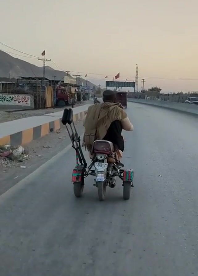 A man is riding a customized three-wheeled motorcycle down a paved road. He is wearing a dark hat, a tan shawl, and dark clothing. The motorcycle is small and appears to be a modified scooter, with two small wheels added to the rear for stability, decorated with red and green stripes. There is a tall, adjustable support structure attached to the back of the seat. The road is bordered by a concrete barrier painted with black and white stripes on one side, and buildings and parked trucks on the other. In the background, there are mountains under a light sky. Flags are seen flying from poles along the road. Other vehicles can be seen in the distance. The camera follows the man from behind as he rides.