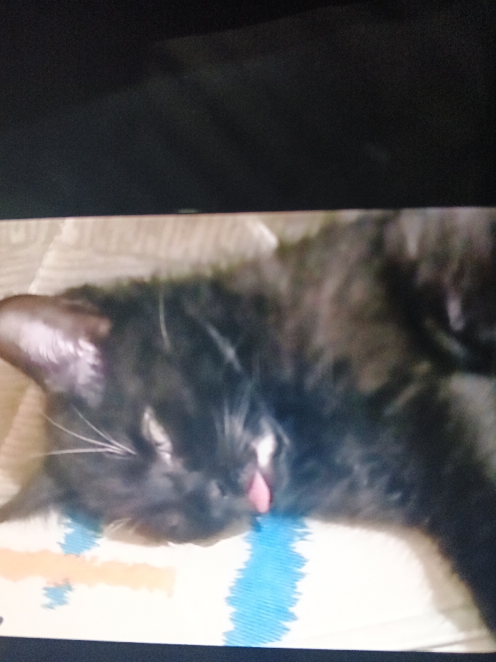 A black cat lies on its back on a patterned cushion. The cat's tongue is sticking out slightly. The cushion has blue and orange stripes on a white background. The cat has white whiskers. The image appears to be taken of a television screen.